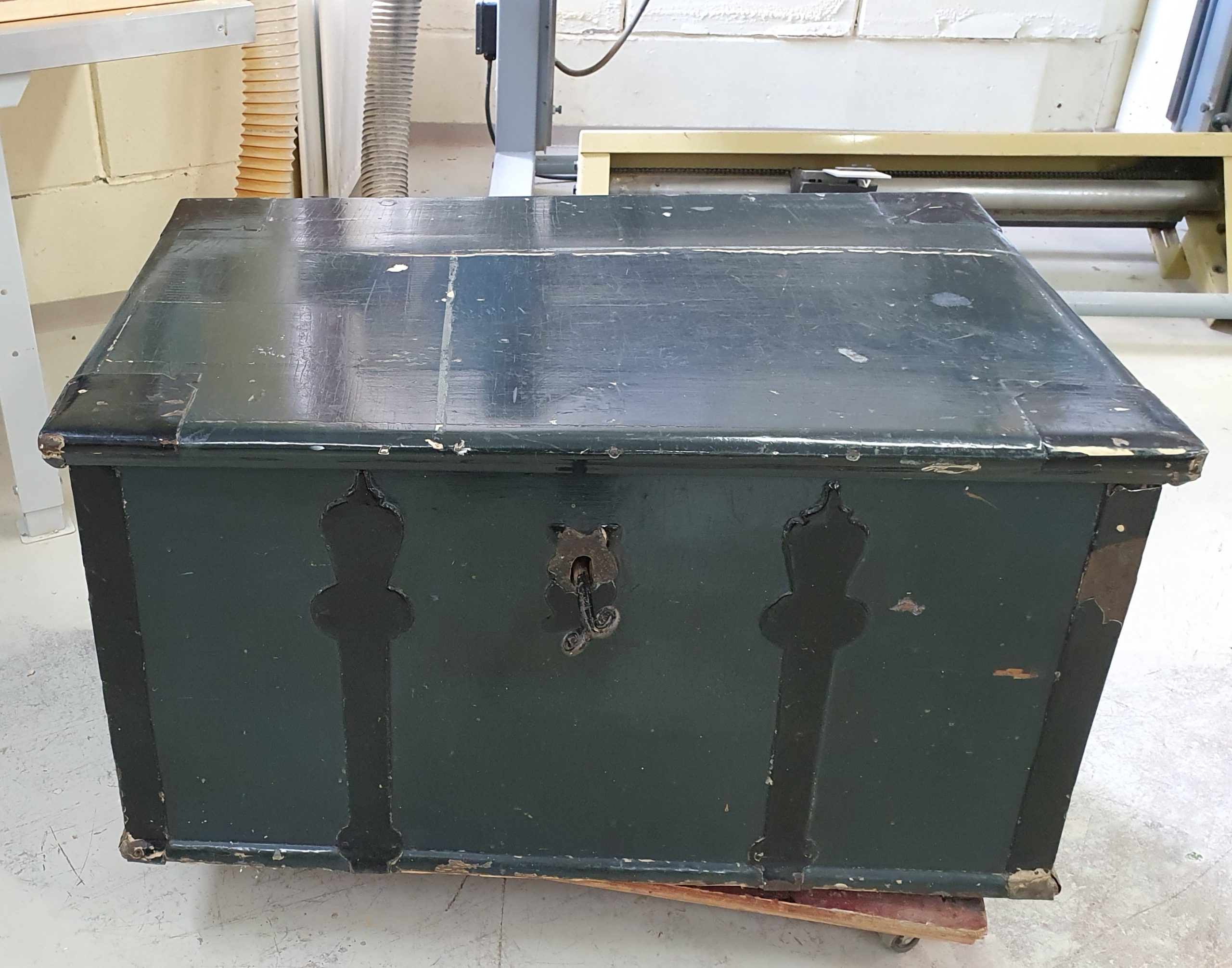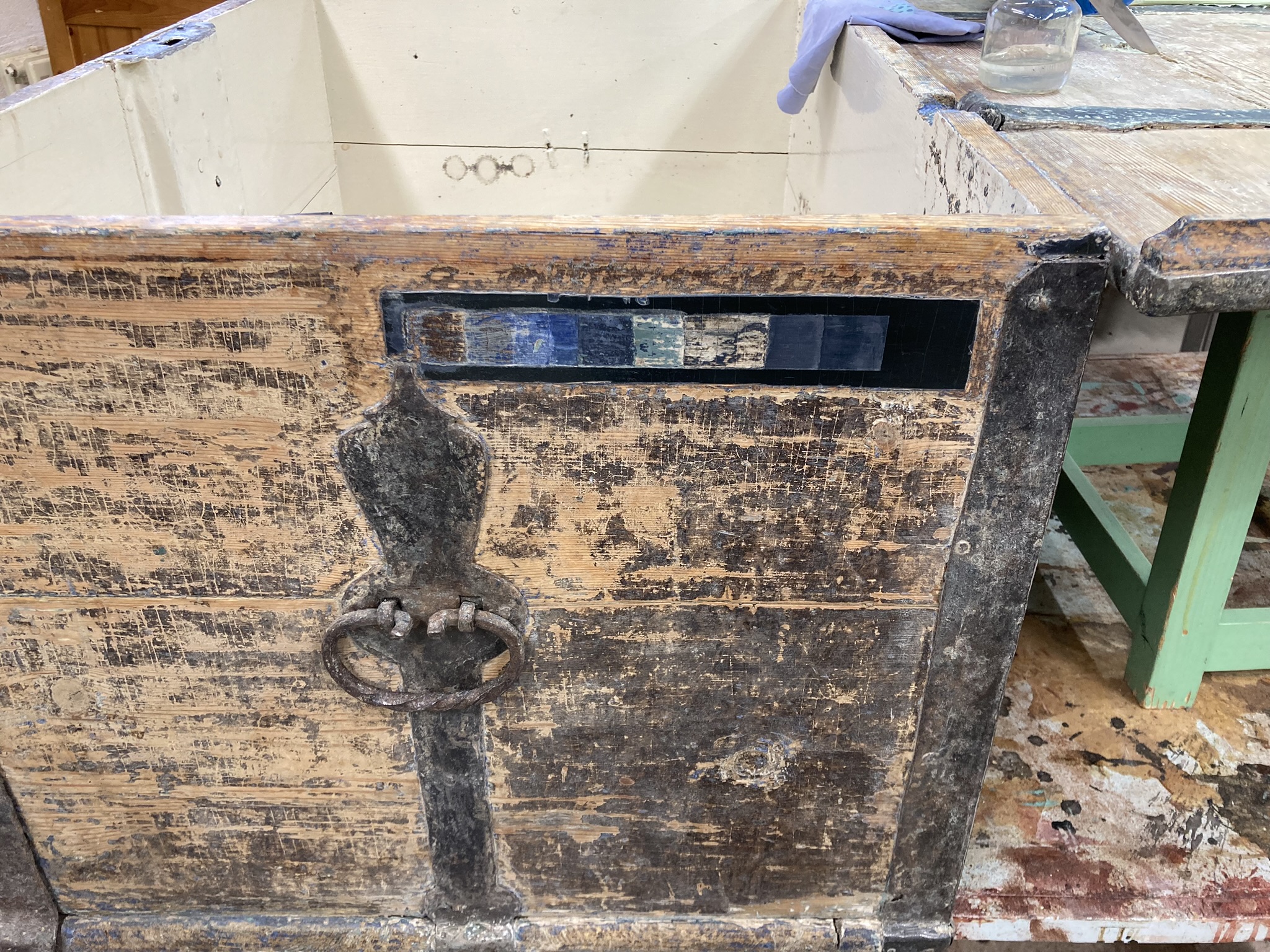 Kuvan arkun maalipinta kätkee alleen melkoisen yllätyksen, kun äkkiseltään melko yhtenäisen ilmeen alta lähdettiin etsimään alkuperäistä pintakäsittelyä.