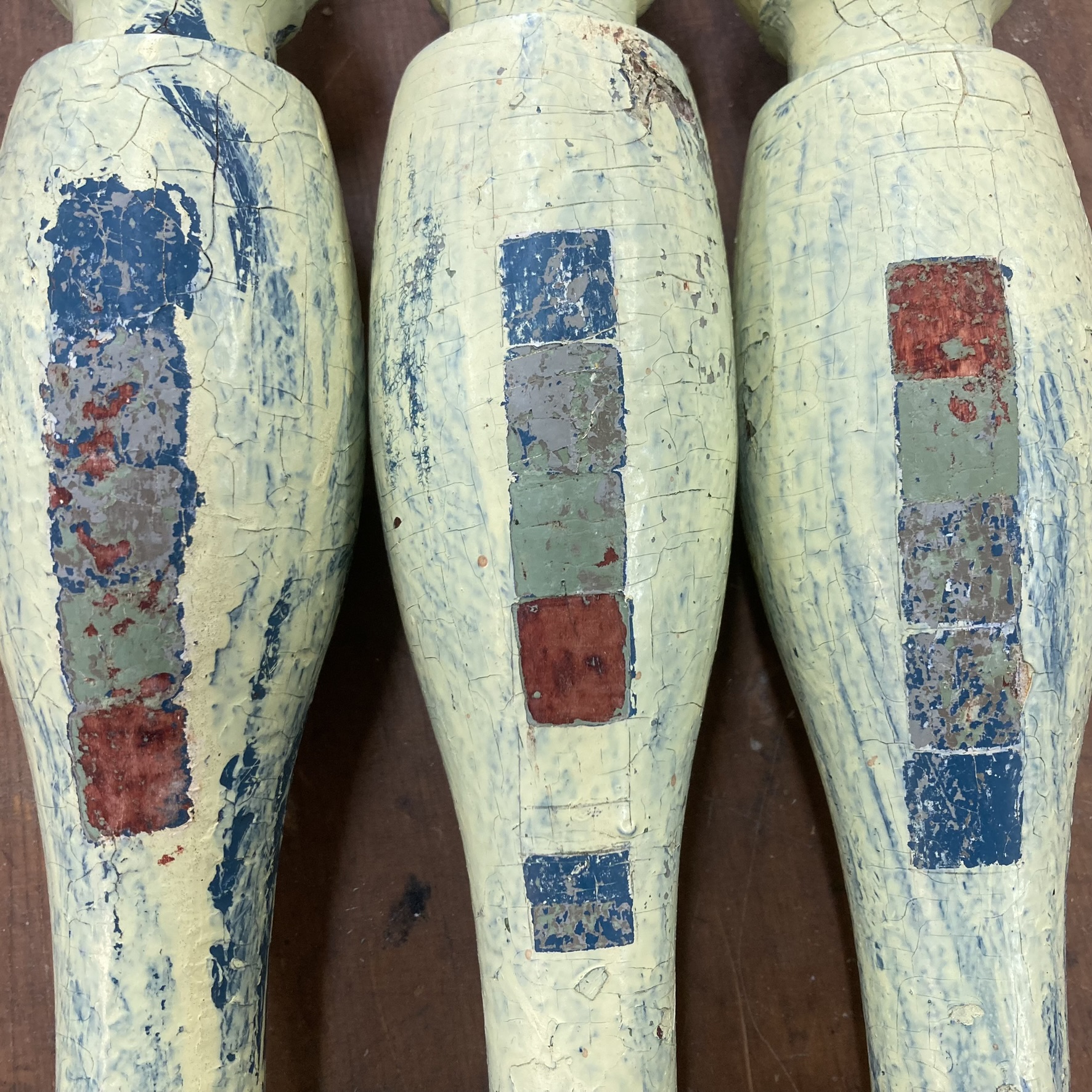 Väriportaikon valmistus saattaa kuulostaa yksinkertaiselta, mutta on todellisuudessa aika hienovaraista ja kärsivällisyyttä kysyvää puuhaa. Värisävyt saattavat olla hyvin lähellä toisiaan, kerrokset eri vahvuisia, ja maalit reagoida hyvin eri tavoin eri kemikaaleihin. Kuvan jakkarassa väriportaikkoharjoituksia, joista parhaiten onnistunut sai jäädä koristamaan valmista kalustetta. Tässäkin kalusteessa ruskea maalikerros vihreän ja vaalean lilan kerroksen välissä oli niin ohut, etten siitä onnistunut saamaan aikaan ”omaa” ruutua.