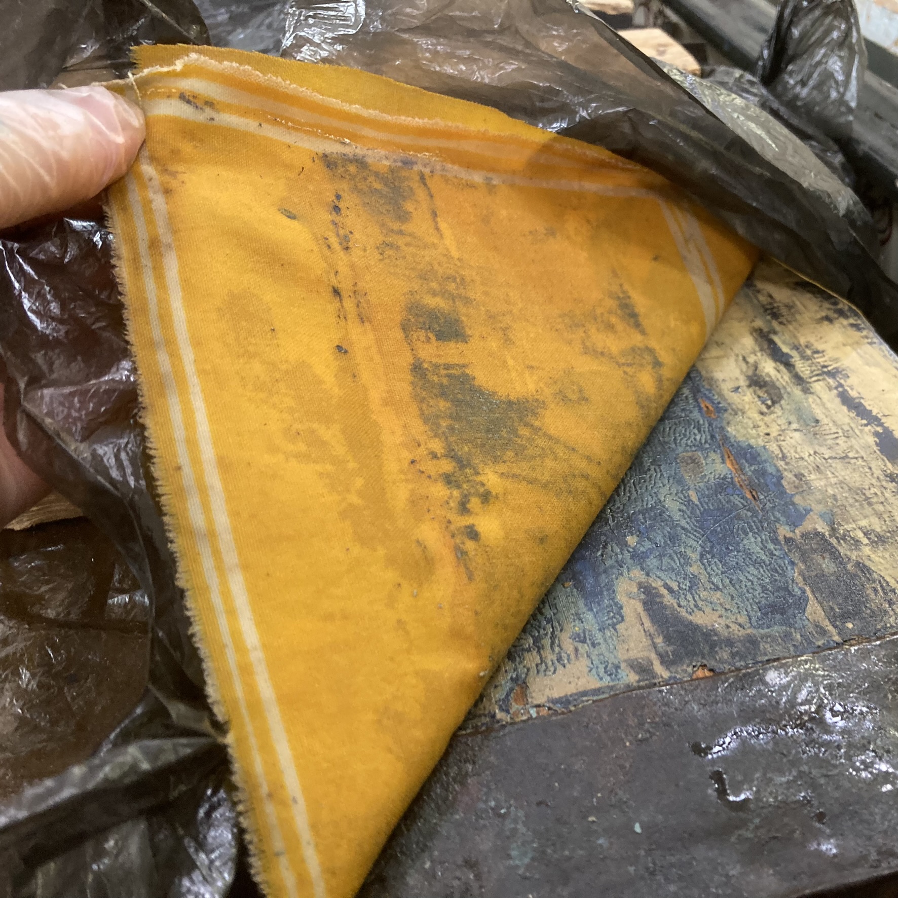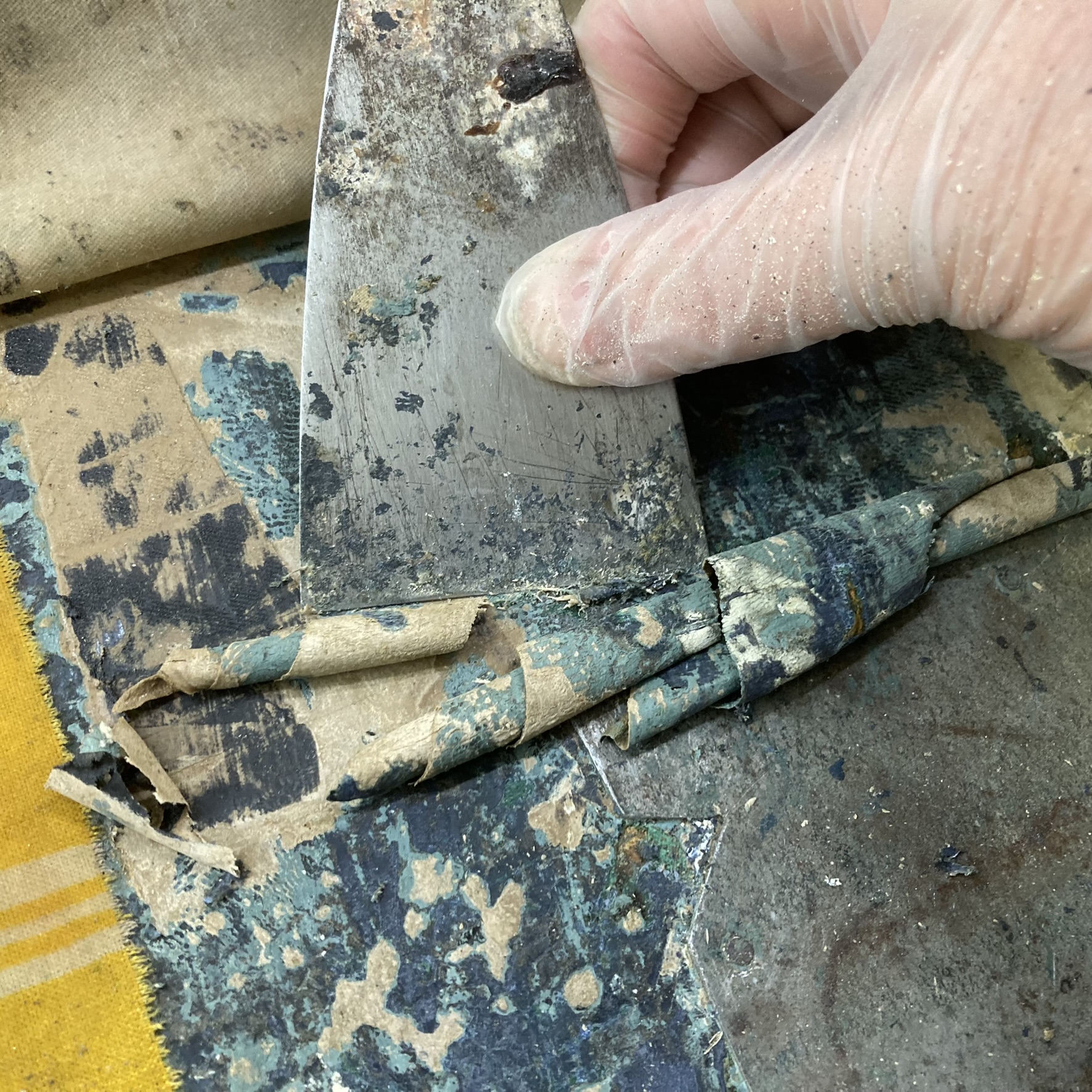 Kuvasarjan arkun paksu päällimmäinen maalipinta kätki alleen lukuisia kerroksia, joukossa useita sinisen sävyjä. Päällimmäisten kerrosten liottaminen vaati lopulta maalinpoistoainetta vahvemman käsittelyn, jossa tinnerillä kasteltu puuvillakangas levitettiin maalipinnalle, ja peitettiin muovilla liuottimen haihtumisen estämiseksi ja vaikutuksen vahvistamiseksi. Puolen tunnin kuluttua päästiin aina kaapimaan yhdestä kahteen kerrosta pois, minkä jälkeen hauduttamista jatkettiin, kunnes useiden toistojen jälkeen alettiin lähestyä alimpia, ohuempia kerroksia, joiden kanssa taas vaihdettiin varovaisempiin työtapoihin.